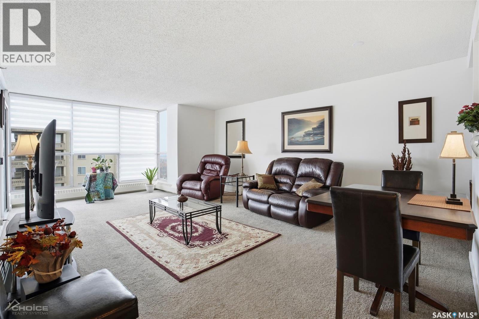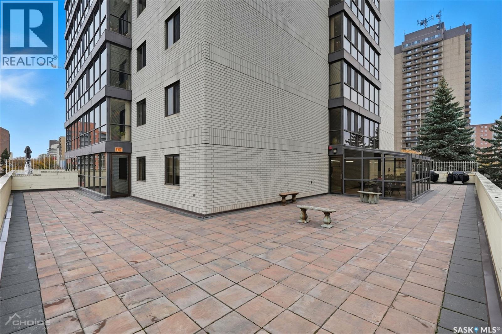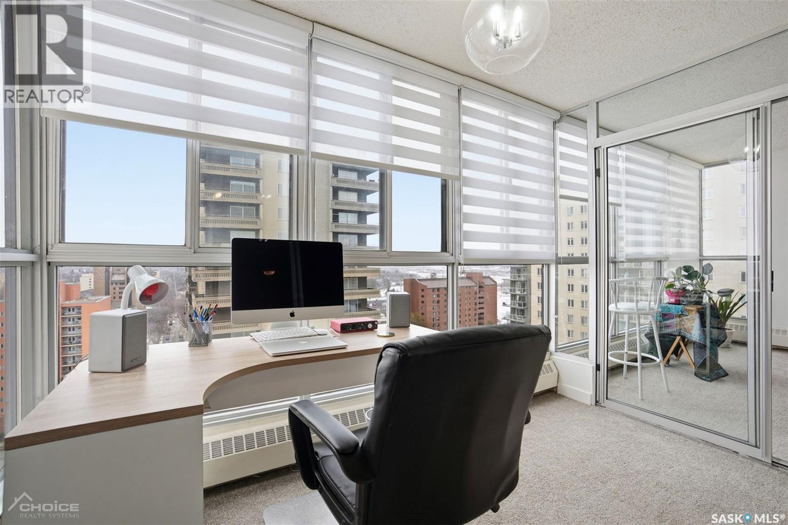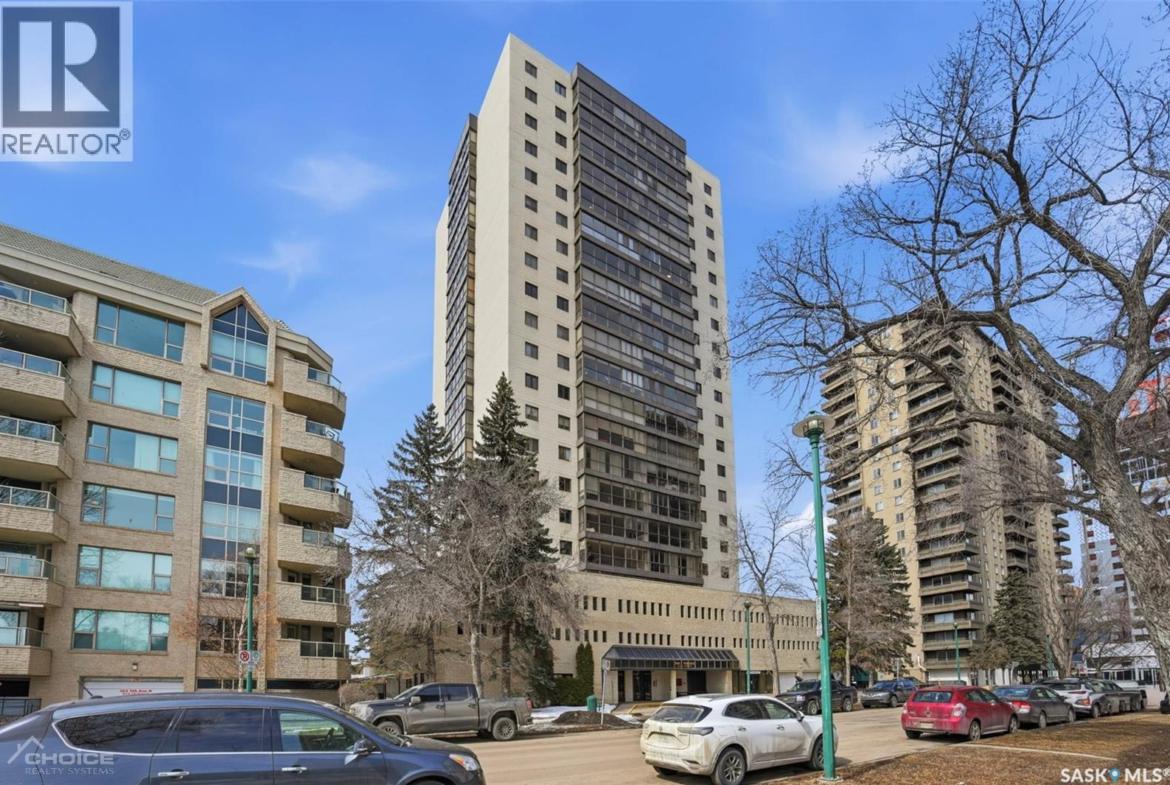 Discover downtown Saskatoon from a lofty vantage point in this beautiful one-bedroom condo on the seventeenth floor of The Terrace on 5th Avenue. Whether you’re a professional, a student, or an investor, this suite delivers a lifestyle that is both effortless and secure. Inside this 850 square foot soundproof condo you’ll find a modern kitchen, comfortable bathroom, generous living space with expansive windows, and a bedroom with plenty of room for a king-sized bed. A den/office and in-suite laundry along with a good size storage room and mirrored closets add convenience. Keyless entry to both the building and the suite. Then come the building perks—enjoy a swimming pool, hot tub, sauna, rooftop deck, BBQs and a welcoming lounge & terrace. A guest suite is available and a live-in building manager provides added support and security. A private parking spot is included. Condo fees cover air conditioning, heat, water, power and all building maintenance and insurance offering excellent value. Rentals allowed. Step outside and you are moments from Saskatoon’s best eateries, pubs, entertainment, and walking/cycling river trails. The University of Saskatchewan as well as Children’s and City Hospitals are within easy reach, making this an excellent home base for students, academics, healthcare professionals, and anyone who appreciates the city’s cultural core. And only two blocks from the brand new Saskatoon Public Library and the YWCA. Opportunities like this are rare—step into a condo that offers comfort, convenience and security. No pets allowed. (29600252)