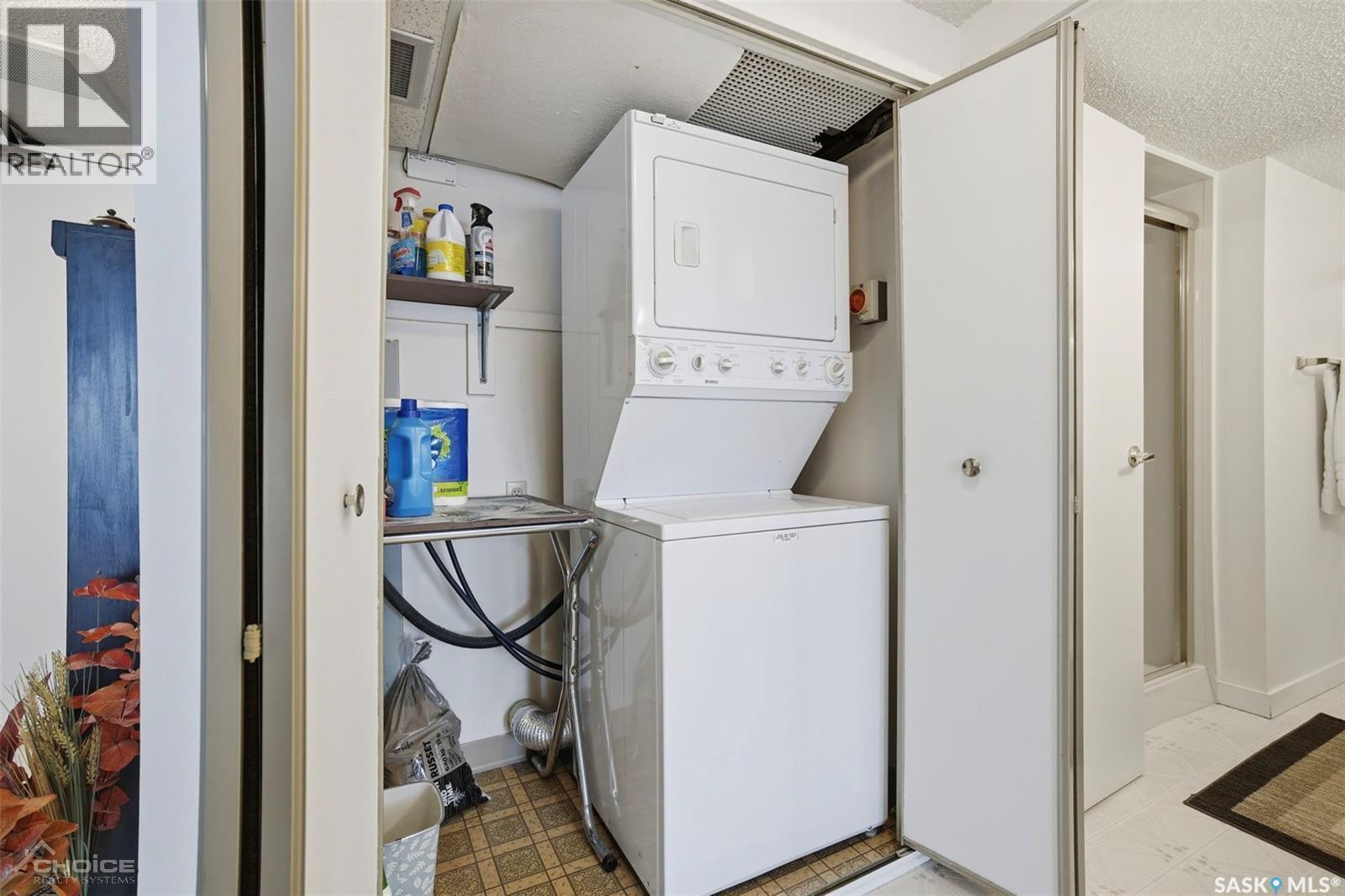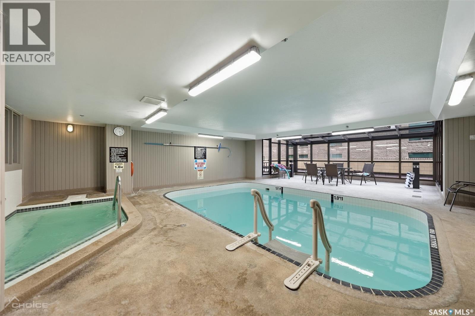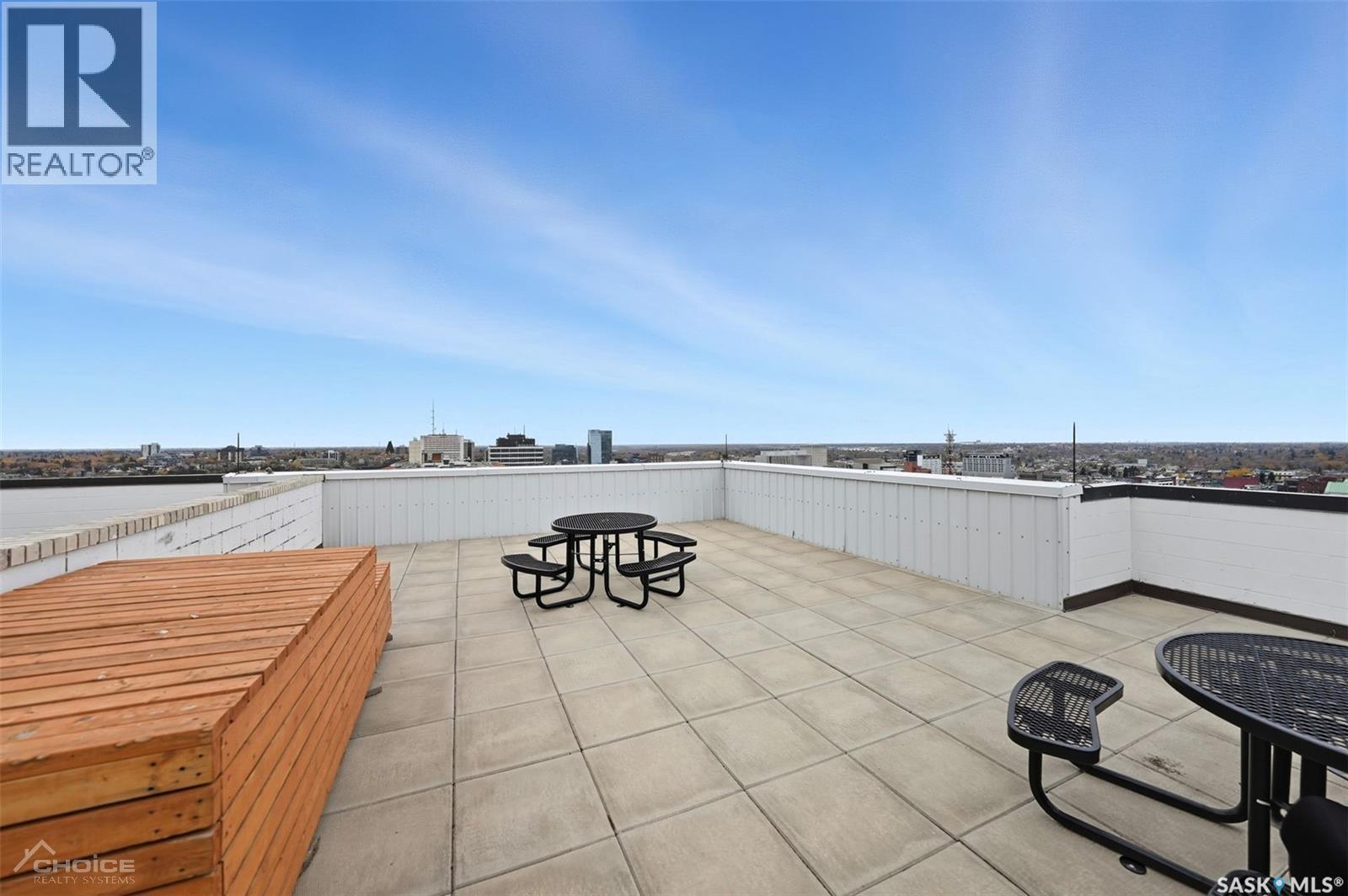 Discover downtown Saskatoon from a lofty vantage point in this beautiful one-bedroom condo on the seventeenth floor of The Terrace on 5th Avenue. Whether you’re a professional, a student, or an investor, this suite delivers a lifestyle that is both effortless and secure. Inside this 850 square foot soundproof condo you’ll find a modern kitchen, comfortable bathroom, generous living space with expansive windows, and a bedroom with plenty of room for a king-sized bed. A den/office and in-suite laundry along with a good size storage room and mirrored closets add convenience. Keyless entry to both the building and the suite. Then come the building perks—enjoy a swimming pool, hot tub, sauna, rooftop deck, BBQs and a welcoming lounge & terrace. A guest suite is available and a live-in building manager provides added support and security. A private parking spot is included. Condo fees cover air conditioning, heat, water, power and all building maintenance and insurance offering excellent value. Rentals allowed. Step outside and you are moments from Saskatoon’s best eateries, pubs, entertainment, and walking/cycling river trails. The University of Saskatchewan as well as Children’s and City Hospitals are within easy reach, making this an excellent home base for students, academics, healthcare professionals, and anyone who appreciates the city’s cultural core. And only two blocks from the brand new Saskatoon Public Library and the YWCA. Opportunities like this are rare—step into a condo that offers comfort, convenience and security. No pets allowed. (29600252)
