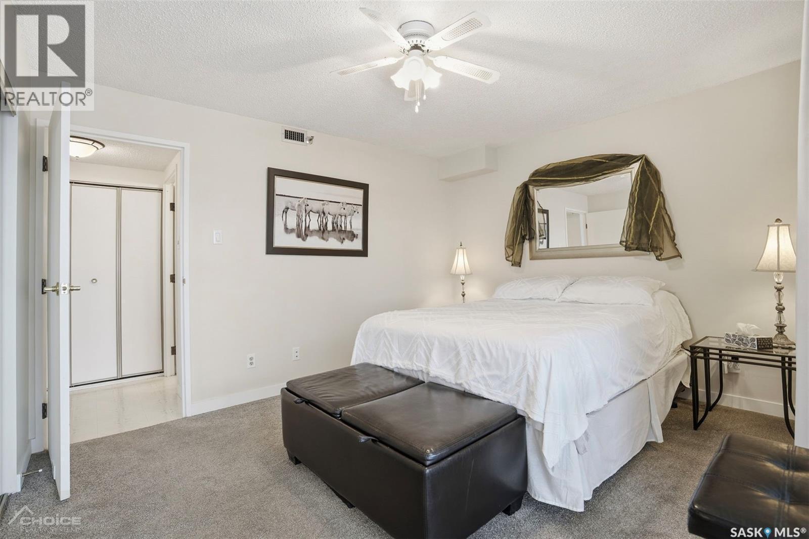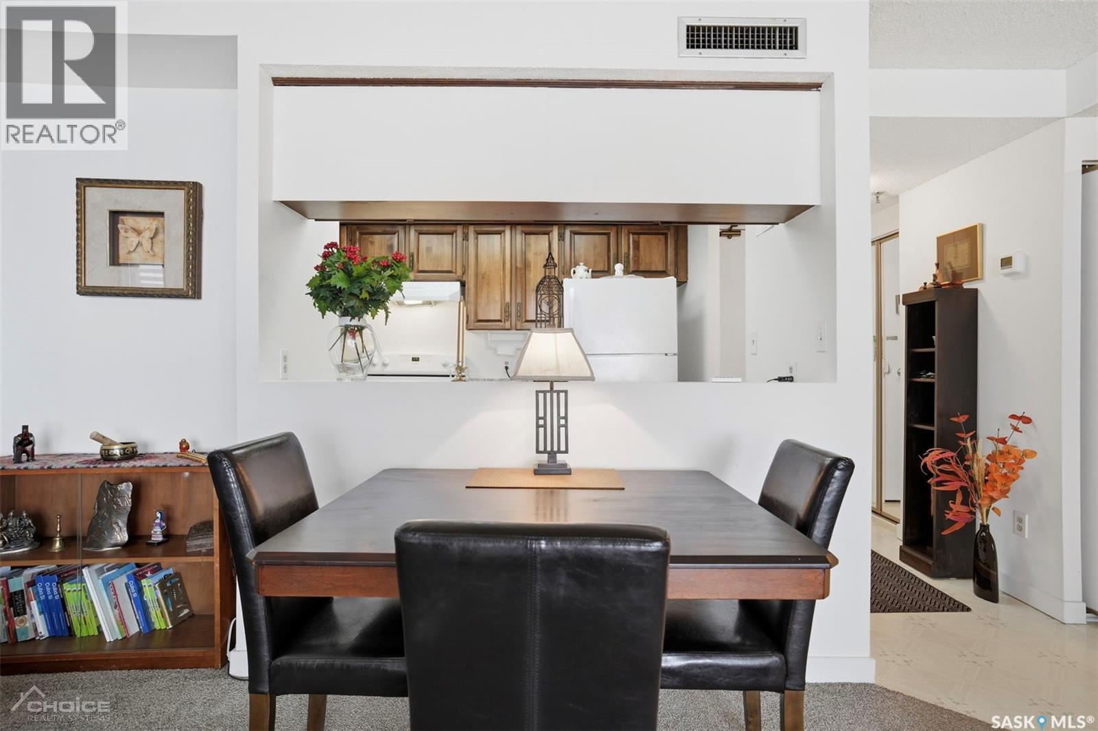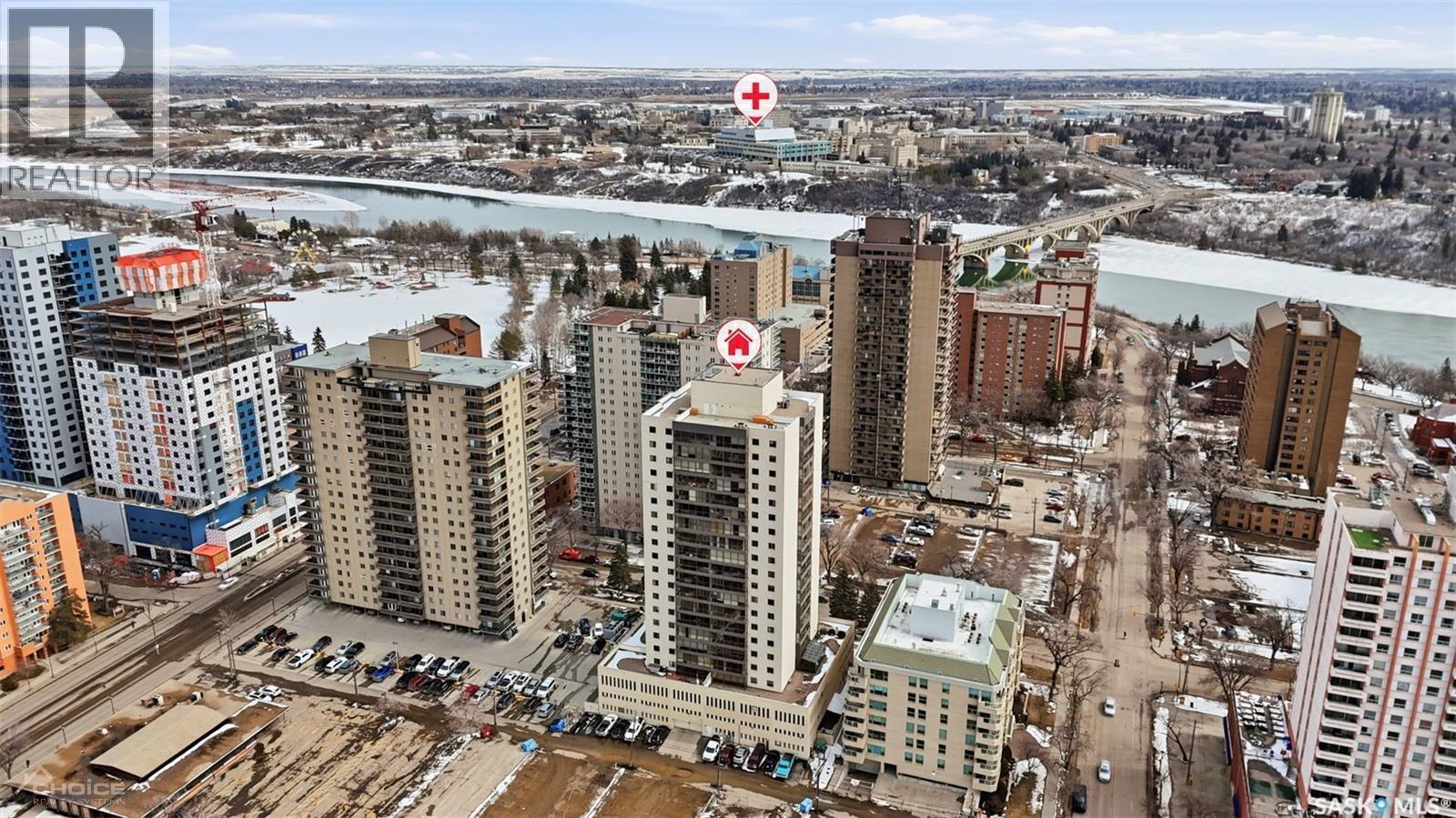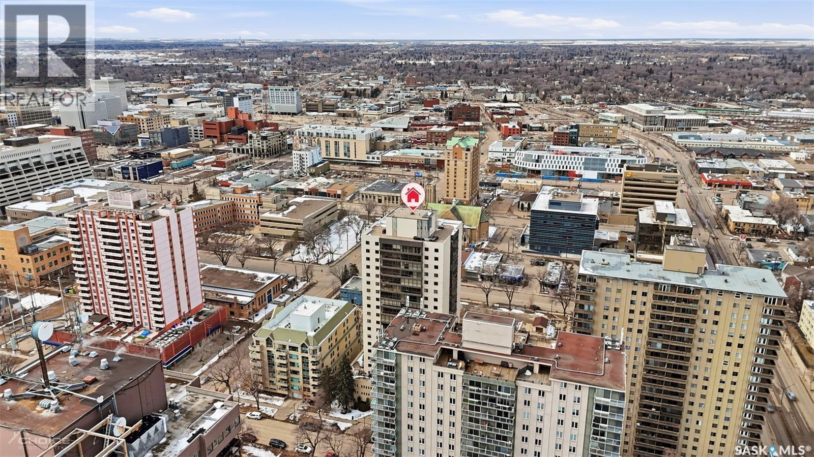 Discover downtown Saskatoon from a lofty vantage point in this beautiful one-bedroom condo on the seventeenth floor of The Terrace on 5th Avenue. Whether you’re a professional, a student, or an investor, this suite delivers a lifestyle that is both effortless and secure. Inside this 850 square foot soundproof condo you’ll find a modern kitchen, comfortable bathroom, generous living space with expansive windows, and a bedroom with plenty of room for a king-sized bed. A den/office and in-suite laundry along with a good size storage room and mirrored closets add convenience. Keyless entry to both the building and the suite. Then come the building perks—enjoy a swimming pool, hot tub, sauna, rooftop deck, BBQs and a welcoming lounge & terrace. A guest suite is available and a live-in building manager provides added support and security. A private parking spot is included. Condo fees cover air conditioning, heat, water, power and all building maintenance and insurance offering excellent value. Rentals allowed. Step outside and you are moments from Saskatoon’s best eateries, pubs, entertainment, and walking/cycling river trails. The University of Saskatchewan as well as Children’s and City Hospitals are within easy reach, making this an excellent home base for students, academics, healthcare professionals, and anyone who appreciates the city’s cultural core. And only two blocks from the brand new Saskatoon Public Library and the YWCA. Opportunities like this are rare—step into a condo that offers comfort, convenience and security. No pets allowed. (29600252)